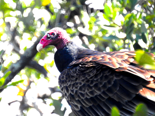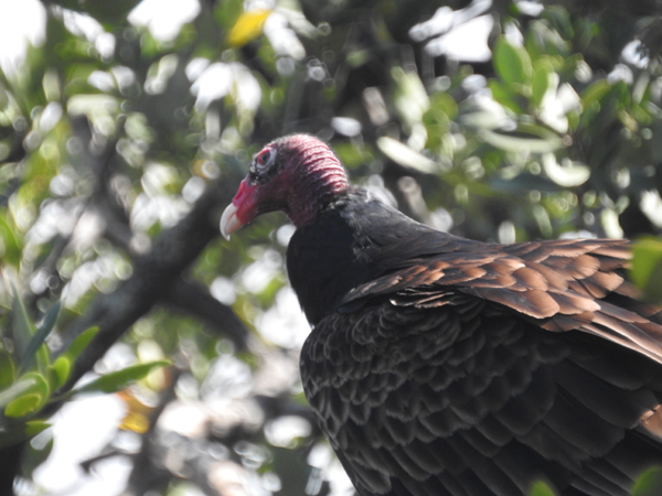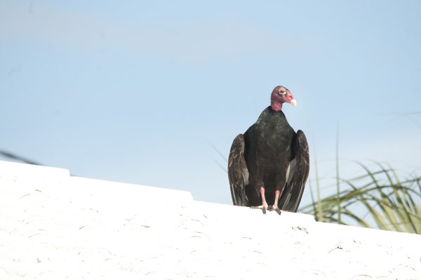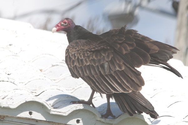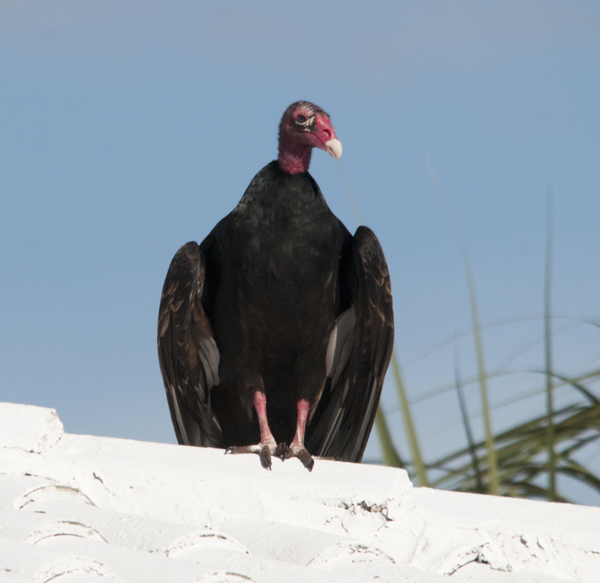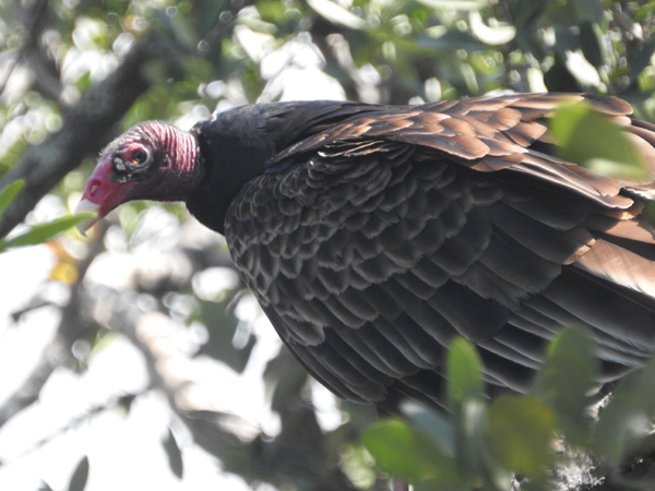 The turkey vulture is a scavenger and feeds almost exclusively on carrion. It finds its food using its keen eyes and sense of smell, flying low enough to detect the gasses produced by the beginnings of the process of decay in dead animals. In flight, it uses thermals to move through the air, flapping its wings infrequently. It roosts in large community groups. Lacking a syrinx—the vocal organ of birds—its only vocalizations are grunts or low hisses.