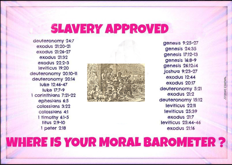 Most modern Christians prefer to avoid, or are unaware of, these sections of the Bible. If forced to explain Biblical justification for slavery, they may come up with something, but fortunately Christians as a group think it would be wrong to reintroduce slavery. Christian attempts to justify what is in the Bible can lead to them sanctioning things that most moral humanists, and even most Christians, would say are wrong.